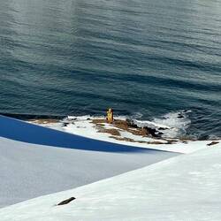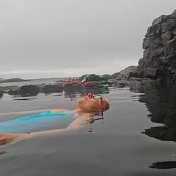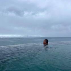 La baignade dans le fjord à peine redescendus. 0 degré dans l'air, 2 degrés dans l'eau. Ça pique, ça pince, ça mord, ça 🥶🥶🥶, surtout les pieds, mais on l'a fait, et dans un cadre exceptionnel !