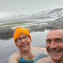 Ce soir, on était content de retourner chez Friđrik Rúnar pour nous délasser dans sa piscine d'eau géothermale. Quels bienfaits sur les cuisses dures et les articulations meurtries ! Mais aujourd’hui, il faisait moins froid qu'hier et il n'y avait pas de vent..., donc l'eau géothermale, qui provient des entrailles de la terre et arrive dans la piscine à une température insupportable au toucher, était à plus de 40 degrés ! Très très chaud ! Piscine et sauna en même temps ! Impossible d'y rester plus d'un quart d'heure d'affilée ! On a donc alterné entre dedans pour se réchauffer et couché sur le bord pour se refroidir 😂 ! Quels plaisirs !