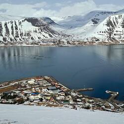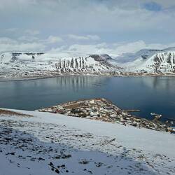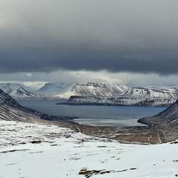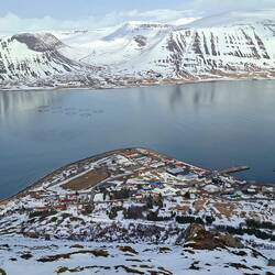 La vue magistrale sur le Dýrafjörður, fjord de 32 km de long, encastré dans les montagnes, et en bas sur Þingeyri.
