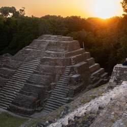 Auch unseren zweiten Tag verbrachten wir bei den Maya-Tempeln im Dschungel. Diesmal besuchten wir Yaxhá, das etwa 2 Stunden von Flores entfernt liegt. Die Tempel sind hier nicht ganz so imposant wie in Tikal, dafür gibt es deutlich weniger Touristen, und die Stadt liegt malerisch zwischen zwei Lagunen. Landschaftlich fanden wir Yaxhá sogar noch schöner und ursprünglicher. Auf einem der Tempel verbrachten wir den Nachmittag und beobachteten den Sonnenuntergang. Von dort hatten wir auch eine wunderbare Sicht auf Klammeraffen, die in den Baumkronen rund um den Tempel spielten. 🐒