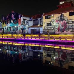 Lundi 17, on se lève, on va manger des gaufres et on commence par prendre le Melaka River Cruise (un bon truc de touristes ça), un bateau qui nous fait remonter la rivière et ses superbes façades peintes pendant environ 30 min. Problème : le bateau va beaucoup trop vite ! Du coup on décide qu’on retournera à pied ou en vélo le long de la rivière. A midi, on se pose sur une petite terrasse le long de la rivière où on mange et on joue aux cartes pendant presque 2h. Ensuite, on passe une bonne partie de l’aprem à se balader à pied dans la ville. C’est vraiment top, la ville est un énorme mélange d’influences portugaises, chinoises et hindoues, ça crée un mélange vraiment unique. Pour le coucher de soleil, on part ensuite en direction d’une pseudo île dans la ville avec une mosquée sur l’eau qui semble hyper réputée sur internet. Le résultat n’est pas vraiment à la hauteur de nos attente : la mosquée (bien flottante) trône au milieu de bâtiments désaffectés ou en construction qui crée une ambiance un peu glauque. On reste quand même voir les couleurs de nuits mais on a pas vraiment de point de vue. On finit par retourner en ville et par se poser boire une bière (ou deux) le long de la rivière et on rejoue jusqu’à presque 23h, où Mag finit par aller se coucher, pendant qu’avec les gars on en profite pour tester les spécialités du McDo de Malaisie.