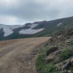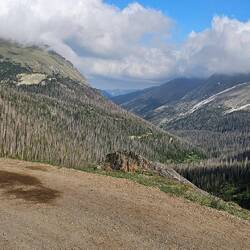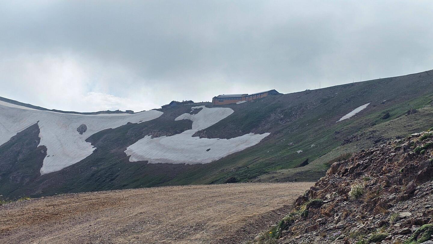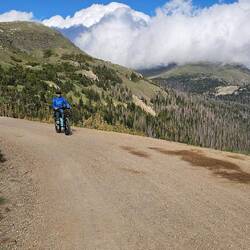 The end of the trail is the Alpine Visitors Center 11,796’. The temperature dropped over 20 degrees along the ride due to the elevation gain . We rode into the clouds - literally. As we reached the top, we found snow (left over from the winter), and the clouds were hitting the side of the mountain and being pushed up. It was like a fog except the fog sits still, and the clouds flow with the wind.Baca lagi