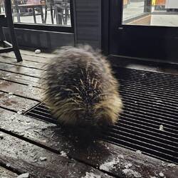 Pat skied for another hour or so and only quit because it became hard to see with the heavy snow fall. I was visited on the deck by a wild porcupine looking for food. He just nosed around for at least 45 minutes, ignoring all the skiers coming and going, many never even noticed him a step away.