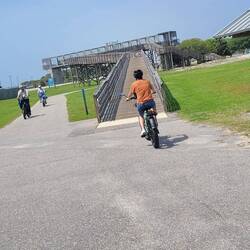 Along with making sure the camper is good to go, we are also making sure the bikes are ready. Today we took a nine mile ride. Walked out on the pier....lots of wind, surf, and rip tides. Then we rodeMeer informatie