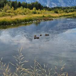 An offshoot of the Snake River trickles into a pond created by a beaver dam. The crystal clear water overflows the dam, a short waterfall, but enough fall that the sound quiets the visitors. Ducks, upside down, feeding in the resulting stream surrounded by reeds of grass 15" tall in varying shades from green to yellow as a sparing amount of wild flowers populate the edge of the pathway.