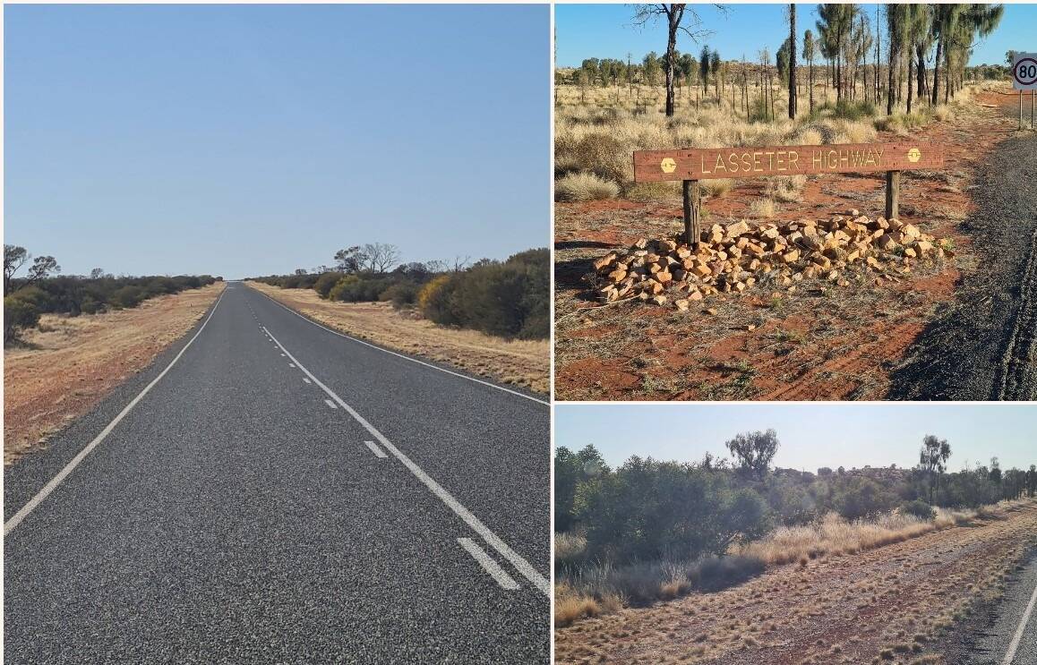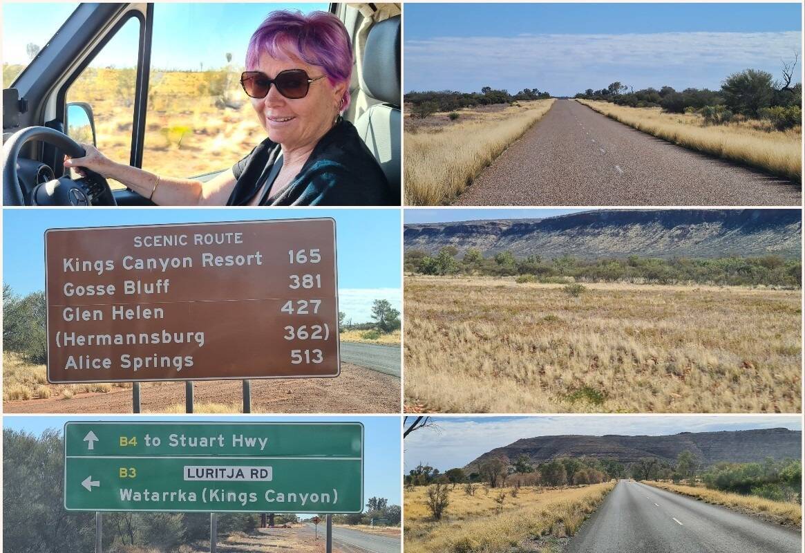 The drive is around 3 to 4 hours along Lasseter's Highway and Luritja Road . So more long straight roads.