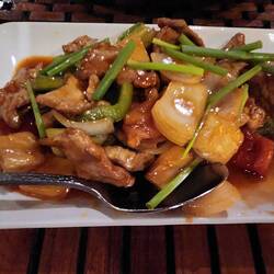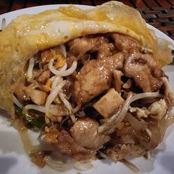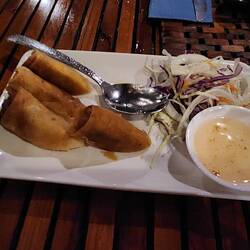 Dinner tonight was much better. Cocktail, beer, spring rolls, pad thai, sweet and sour pork, and a very naughty dessert.