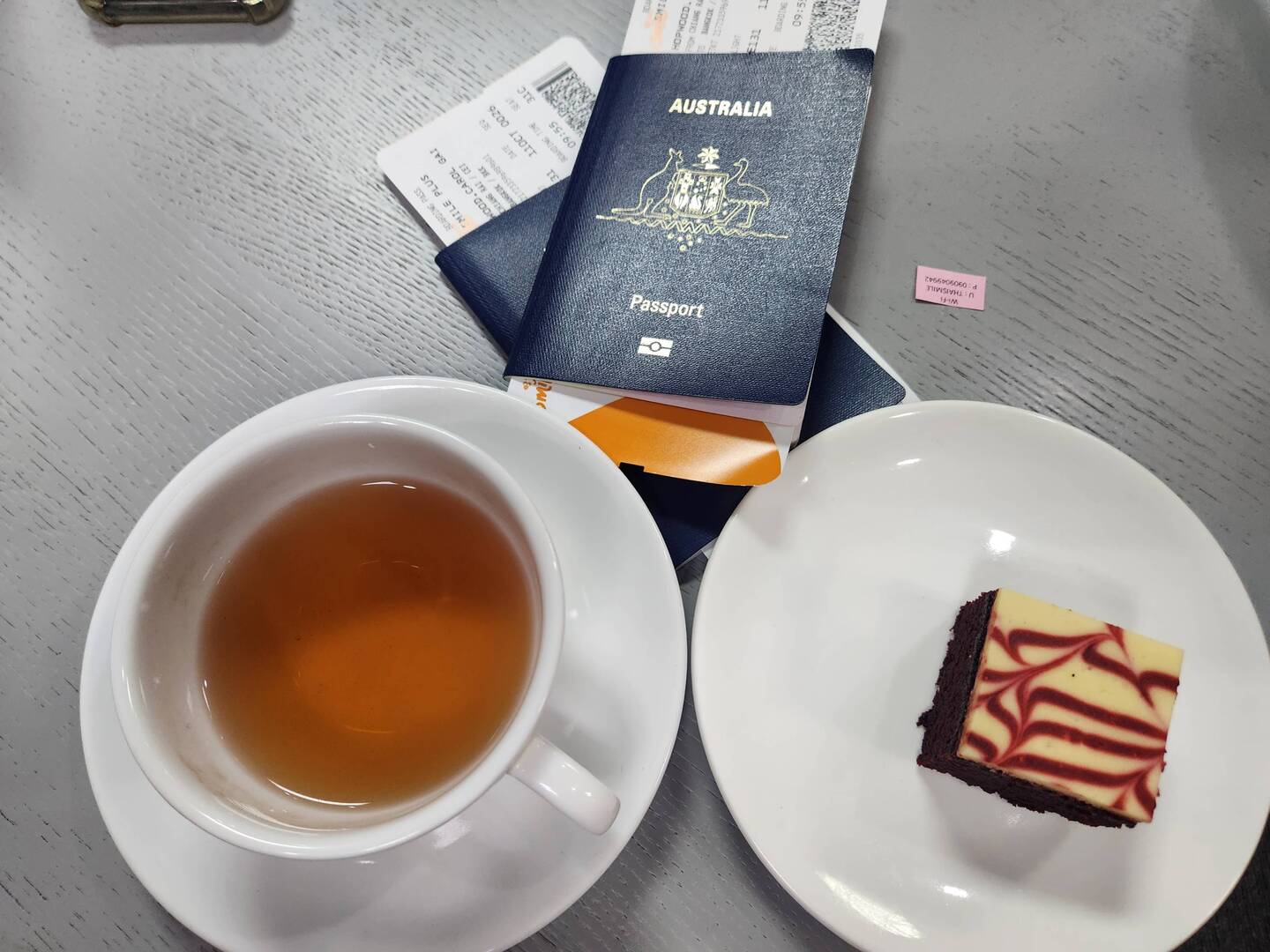 At the Airport in the lounge waiting for our fight to Bangkok. Morning tea cup of tea and chocolate brownie.The tiny pink peice of paper has the wifi code, magnifying glass required.