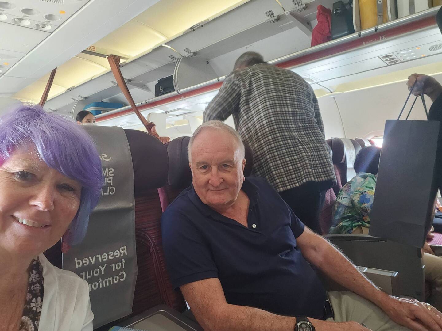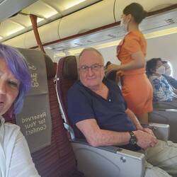In the air after a 1 hour delay. We even managed front of the bus at no extra charge with yummy food.