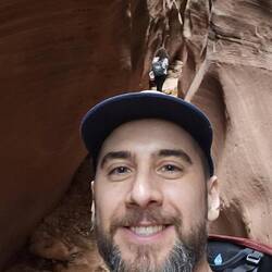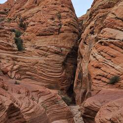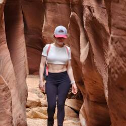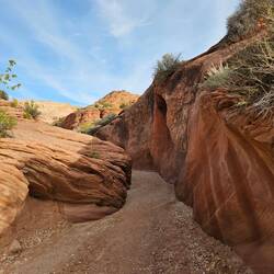 Los primeros dos kilómetros avanzamos por el arroyo seco, cruzando barro con grietas de desecación y grandes bloques de piedra. Hasta que de repente, empieza el cañón, así de la nada aparecen dos paredes rojas de 3 metros de alto y el curso de agua pasa a tener menos de 1 metro de ancho. ¡Lo encontramos! Desde allí, todo fue una sorpresa atrás de otra. Las rocas son de un color rojo intenso, mucho más que en Antelope, y la estratificación de las unidades de arena es muy marcada. Hay varios descensos bruscos dentro del recorrido, tal es que en uno instalaron una escalera de más de 2 metros de alto. Sucede que son grutas generadas por facturas y luego lavadas por "flash floods" (flujos turbulento que se encajonan en un cauce pequeño y liman los bordes con todo el material que transportan). Al ser cañadones tan angostos, incluso una ligera lluvia puede terminar generando un flujo super riesgoso.