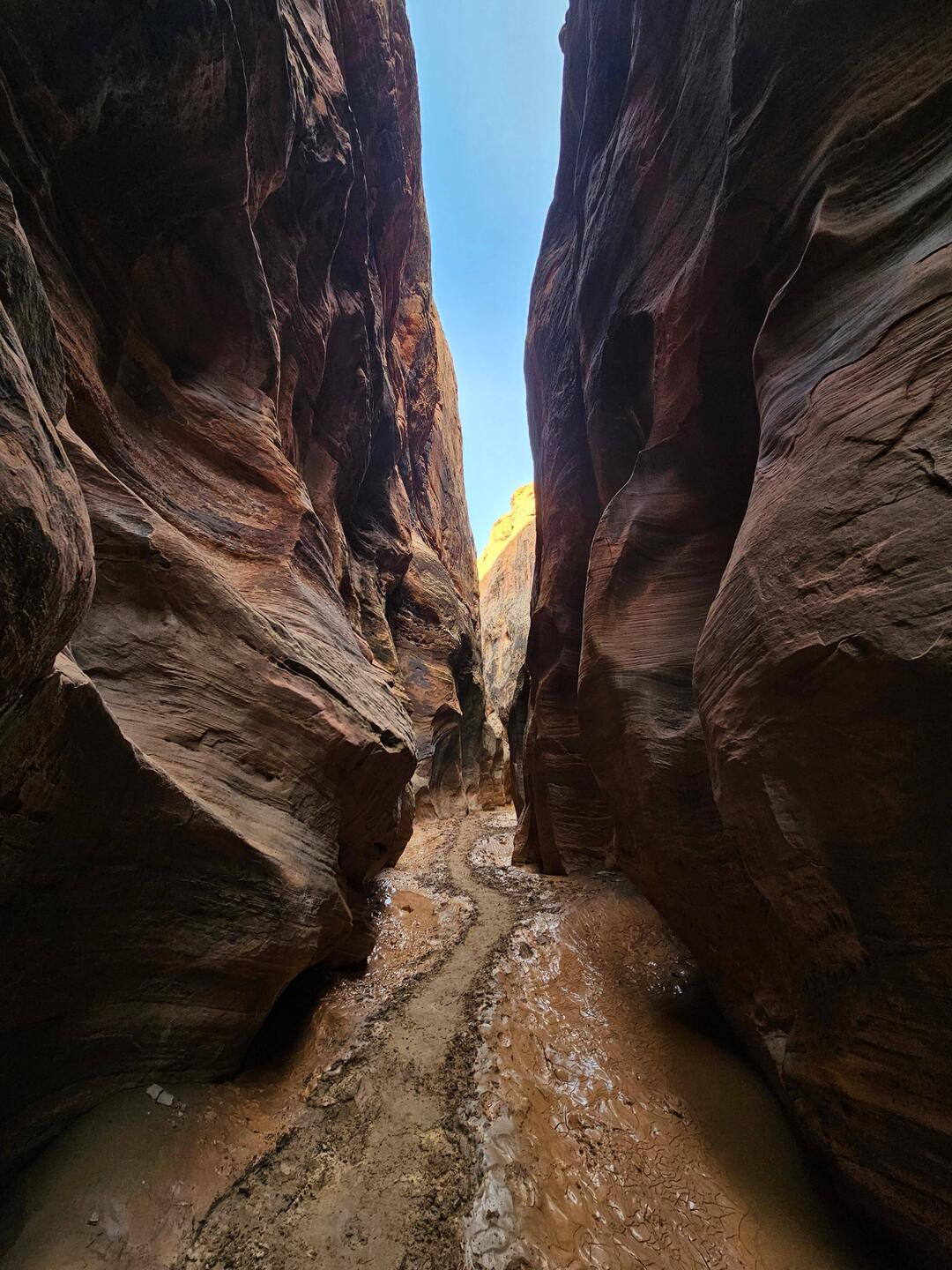 Los otros dos caminos posibles (el Buckskin Gulch original) por los que podíamos continuar tenían charcos de agua oscura y barro. Tomamos la decisión de terminar allí nuestra aventura. Lo que nosotros recorrimos fue el “Wire Pass”, para seguir recorriendo hay que estar más equipado, en especial por el barro (equipado o resignado a embarrarse).