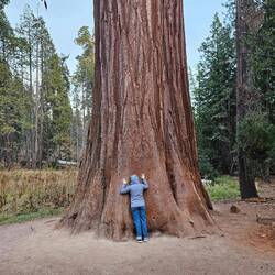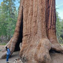 Pasando por varios sitios muy fotogénicos (árboles gigantes, miradores altísimos, sectores con la ruta partida por árboles separando los carriles) manejamos durante una hora hasta el Congress Trail. Es un recorrido de una hora a pie cruzando grandes árboles Sequoia que los han llamado “The Senate”, “The House” (ambos son conjuntos de árboles gigantes y muy cercanos entre sí) y que se une con otros paseos aún menos concurridos. Paseamos un poco en soledad al ingresar a sectores menos populares pero debimos regresar al paseo masivo para ver el famoso “General Sherman Tree”, el ser vivo más grande del mundo (en volumen y peso). Es tal el tamaño que tiene que desde donde estábamos es imposible tomar noción de sus proporciones. Los carteles nos dijeron que tiene 11 metros de diámetro y 80 metros de alto y que la razón de su crecimiento no es la edad sino que la ubicación (mayor disponibilidad de sol y nutrientes). Esto es, hay otros árboles Sequoia más antiguos (3200 años) que este (1700). El paseo de una hora duró en total un poco menos de dos horas así que volvimos al auto e intentamos no distraernos en el camino hacia el norte.
