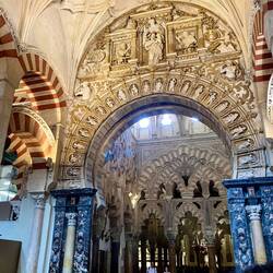 Stopped for refreshments- croquetas - this time with prawn and spinach - and then went to the Mesquita for our 2pm time slot…we had bought tickets online, but of course found out today that for this we could have got them on the spot!! Oh well…it was easy. And very popular…many many people, but this is such a vast area it doesn’t feel too crowded. It was built as a huge mosque in 788 AD with many columns, and when the Christians overthrew the Arabs they turned it into a huge cathedral in the 1200s. It is an extraordinary building, with the columns and lamps like a mosque, then you find a gothic cathedral structure all amongst it. Fortunately they kept a lot the beautiful Islamic decoration…it is a huge area, and there are chapels all around the edge. It is hard to describe, and impossible to take photos that capture the whole, but of course we all attempt to.