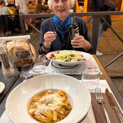 …Now just back from dinner. We left the hotel early, walked up to piazza Republica and down the Via Veneto where all the very posh hotels are, and the American embassy. Ended up in piazza Barberini and had a drink watching the passing parade and crazy traffic - almost as mad as piazza Venezia! Then we walked to our restaurant on via Napoli. It was about 7.30 by then, and we were lucky to get in without a booking. They were busy and it is always so good. We had a wonderful meal - started with marinated anchovies, then Amr had a cod pasta, topped with a zucchini flower, and I had sautéed kidneys, and we had a salad and a half litre of wine. One thing that amazes us is that it is cheaper than 20 years ago. In 2002 we were happy to have dinner for under €80, and these days our dinners are often under €60! And this is comparing euros, not thinking of exchange rates….Anyway, another lovely evening. Tomorrow morning we take a train to Venice at 9.55am…nice and leisurely!Læs mere