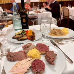 Just have to add that we are now back from Diana (where we had lunch in 1991 with Paul and Omnia) and what a great night! It is now quite a posh upmarket restaurant (maybe it was then, but we don’t remember it like that!)…anyway, it was wonderful. A change from the places we have dined in the last few days, which though fun, were not elegant. Tonight was relaxed enough, but a real restaurant, and the food was fab and it was fun watching the whole place throb! (And it wasn’t much more expensive than the other places, even including a Sangiovese riserva ….we were treated to a Prosecco and amuse bouche on arrival, and then Amr had a bollito misto with a salsa verde (a selection of boiled meat - divine for Amr!) and I had veal with porcini mushroom sauce, and we had grilled vegetables…SOOO good. We prolonged the experience as long as possible, with dessert and coffee (Amr)…an excellent night.Læs mere