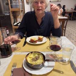 Dinner tonight in the hubbub of restaurants - we always choose a different one. Good meal. I started with ratatouille and Amr a salad. Perfect as I wanted a veg fix, then we shared a lasagne verde, with mortadella and pistachio! Different and yum! And we got chatting to the couple at the next table (always rather intimately close) - they were Swiss, live in Bern, and she is Japanese.