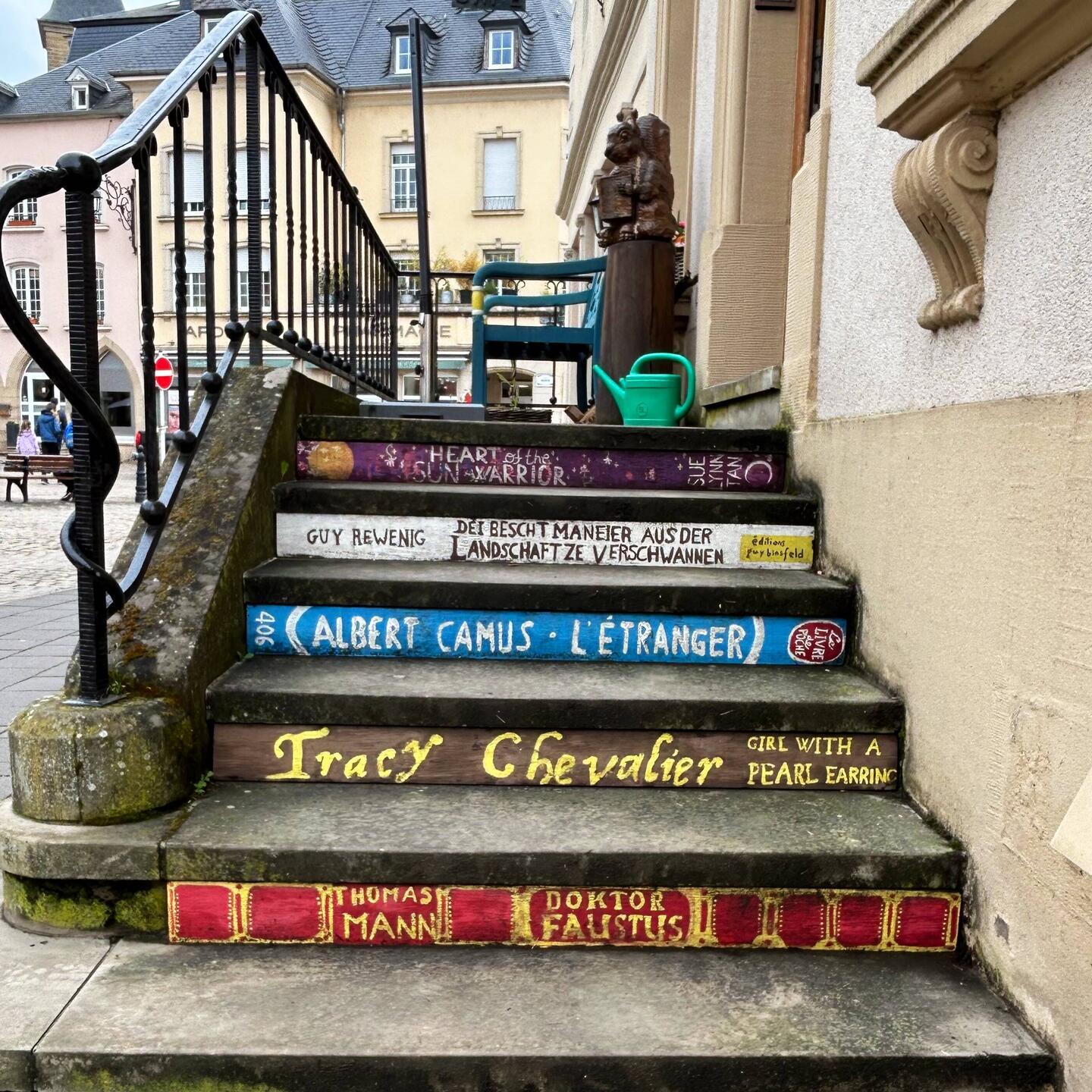 Het eerste wat ik hier in Echternach zie is deze trap. Deze trap is de entree naar een pittoresk boekwinkeltje. Hoe schattig om je tredes zo vorm te geven…. 📚