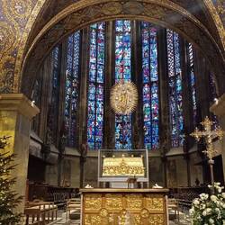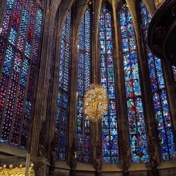 Vom Oktagon hat man eine tolle Sicht in Richtung Westen auf die gotische Chorhalle mit dem Marienschrein, welcher die vier großen Aachener Heiligtümer beherbergt: Die Windeln und das Lendentuch Jesu, das Kleid Mariens und das Enthauptungstuch Johannes’ des Täufers, die seit dem Pestjahr 1349 alle sieben Jahre im Rahmen der Aachener Heiligtumsfahrt den Gläubigen gezeigt werden. Wird schon stimmt 😉.