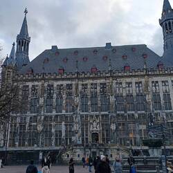 Vom Katschhof sieht man auf die Rückseite des Aachener Rathauses, mit seiner 2014 fertig gestellten neuen Freitreppe. Tolles Ensemble 👍.