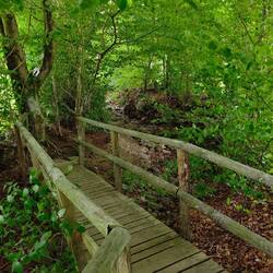 Nachdem ich den Eifelsteig in Hahn wieder gefunden habe 🫣, geht's direkt in den Wald, immer dem Bach Inde entlang in Richtung "Freizeitgelände Walheim". Man passiert kurz hinter Hahn den verfallenen, leicht mystisch angehauchten Kalkofen "In der Au" und überquert mehrmals die Inde - manchmal mit und ohne Brücke.
