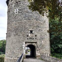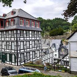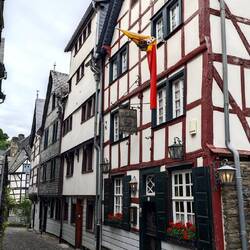 Auf der anderen Seite der Straße führen zum Teil steile Treppen unmittelbar ins Epizentrum von Monschau. Man sieht schon die Burg, mit ihrem "fetten" Wehrturm. Das alte Gemäuer wurde um 1200 erbaut und hat sicherlich schon einiges erlebt. Heute findet man in Teilen der Burganlage eine Jugendherberge und ein Altenheim. Im Sommer wird der Innenhof als Veranstaltungsort für Freiluftkonzerte genutzt.