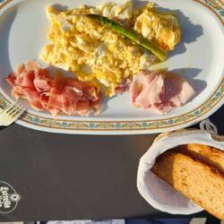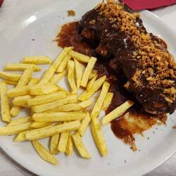 Ribs... its what's for dinner.😋 At our table we had, 2 men from South Korea, one Boy for Milan riding his bike, and one man from Ireland. Lovely people on their adventure.