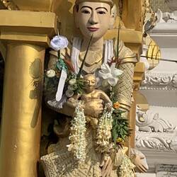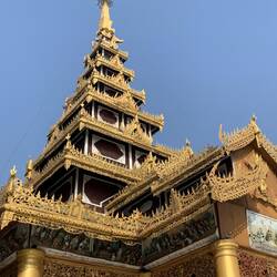 Large hall in the shape of mythological Karaweik Lake. From a distance the Karaweik Hall looks like a huge golden barge floating on Kandawgyi Lake, glittering in the sun.