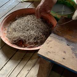 We prepared sticky rice balls for the elephants which included mashed bananas, the banana peel torn into bits, tamarind seed pods, vitamins, and a green plant we chopped into bits. We formed them intoもっと詳しく