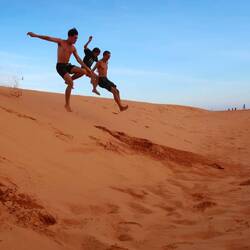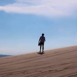 ✔ Med sandet som naturlig støddæmper kunne vi glide ned med kæmpe skridt. Hvad der havde taget 4 timer at bestige tog 10 minutter at løbe ned.