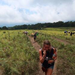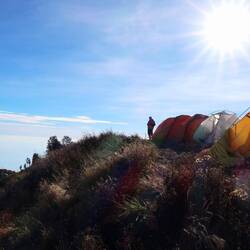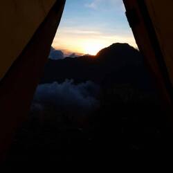 Vi startede i 700 meters højde og gik de første 1.600 meter op, indtil vi om aftenen ankom til lejren med en betagende udsigt over Rinjani’s kratersø. Trætte, ømme, men ekstatiske over udsigten, spiste vi aftensmad, og allerede kl. 20 krøb vi i teltene. For kl. 02 skulle vi afsted igen.