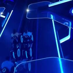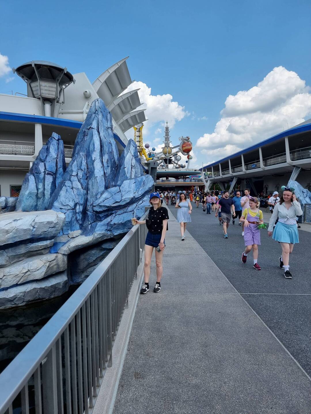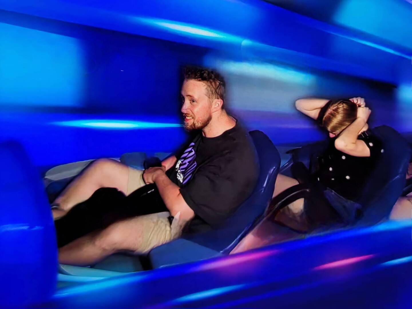 We go on Space Mountain, one of Sean's favourite rides, and get prime seating. Becky is so excited she decides to do her hair in the middle of the ride.
