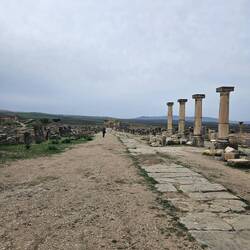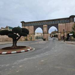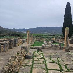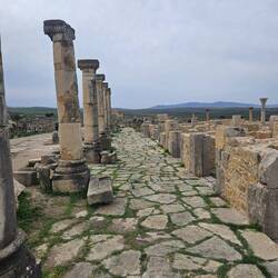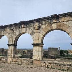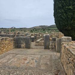 Our journey towards Chefchaouen then took us toward the ancient Roman town of Volubilis. I am a stickler for an ancient Roman town, and this one represented the most southern Roman settlement in the world. As is very typical for me, I had no idea that we would be doing this today, as I am blissfully unaware of the itinerary from day to day, but I was pleasantly surprised when we began to wander the old ruins. Though I had seen many by now, these ruins were unique for their number and quality of mosaics and the easily understood city and house layout. It became very easy to imagine yourself walking through the town in the 2nd century AD, exploring the markets, the forum, the Basilica, and lavish houses that litter the main road. The particularly extravagant houses are highlighted by the number, detail, and grandure of the mosaic images that line the floor. The immersive experience only being amplified by the images that they reflect. Religious moments, legendary stories, personal experiences, all being included in the murals. If you look closely at the photos I attach, you will see the 12 labours of Hercules, Bacchus (the goddess of wine), events from the local collosseum (which hasn't yet been uncovered), and even portraits of the wealthy land owners. This last point was quite surreal for me due to the detail in which these murals are created. It is hard to believe that a building constructed in the 1st Century AD, I could look at today, and see the person responsible for its construction, with imaculate and intricate detail. A kind of mindblowing experience. These murals are capable of maintaining their colour as a result of the stones in which were used. These don't use painted tiles, but lapis lazuli and green gemstones. This ensures that they don't lose their colour from sun and rain. These murals alone made this one of my favourite Roman experiences, up there with Ephaysis, pompey, kekova Island, and even the Roman Forum. This provided a unique insight into how African and Roman cultures both impacted on one another, something that I was yet to experience during my travels. We finished the tour by standing under the Basilica, built after Christianity became the dominant religion during Constantine's reign, while still being able to see the old Roman gods temple. This must have existed hundreds of years before rhe Basilica, and was in a condition that reflects that. It's mostly just a set of stairs and a sacrificing stone. It was mostly good for one final view over the ancient ruins. Although the Romans occupied this town from the 1st Century BC to the 4th century AD, there were native occupants all the way up yo 1755 when the great earthquake of Lisbon destroyed the city once and for all. An earthquake whose scars remain all over Morocco to this day and has been a talking point many times throughout our tour. The majority of Meknes restorations are also needed as a result of this earthquake.