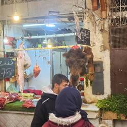 We then strolled through some of the markets that sell mint, dyes, spices, herbs, meat, seafood, leather, silver, jewellry, and many other ancient and modern products. It was incredible to experience. The marketplace has been restored in the likeness of the ancient markets, and the vendors make and sell similar products to that which would have been sold in the BC years. They even have the production of bronze products being done in the middle of the market. Of course, it was done using ancient techniques, which once again added to the experience. Seafood and meat stores would hang the heads of the animals in which they sell the meat. It is quite confronting and shocking, but it is how it was back in the day, and they stick to their traditions. It's not a good place to be vego, though, that's for sure. The tour of the markets ended in the tannery, in which they dye the leathers to make bags, jackets, shoes, etc. I had been told that the smell can be horrific, but it was not as overwhelming as some had described it. I think the cooler weather and the mint provided aided this. It was really cool to watch from the balcony of the leather store, in which you could watch them soak and remove the hair before dying and drying the material. It was quite an operation and interesting to watch. An ancient and traditional technique, the companies receive funding to keep it this way to continue to provide an authentic experience of the ancient Medina. We sat and watched for quite a while before exploring the store and seeing the final product of the horrid smell. I didn't even want to ask the prices of items, and so I didn't. Although probably good value, it would be too difficult to carry while travelling.