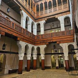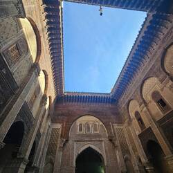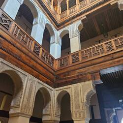 The second to last stop for the day was the wood museum. This wasn't overly exciting, and we basically ignored the wood and just explored the building instead. The building was once a hotel for travelling merchants and traders, and the layout was quite interesting. The open courtyard would be to store the horses camels, or mules, while the small rooms downstairs would be to securely store their merchandise. The larger rooms upstairs were for the merchants themselves and were quite well sized compared to the student accommodation. Though, of course, this is due to the wealth discrepancy. We then got a bit of a view of the Medina from the roof before moving into our final visit for the day.