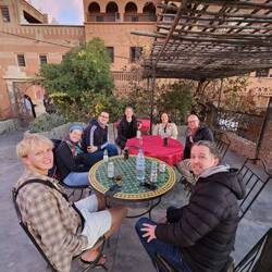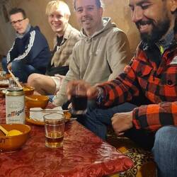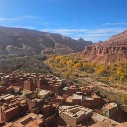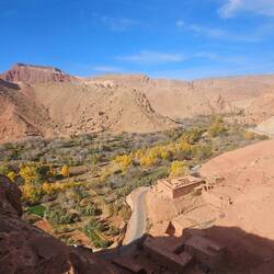Today was a rather relaxed day compared to the previous week and a half of activities, tours, and driving. We started with a walk around the town of Bou Thara and a wander through the canyons and up to a viewpoint of the town. This was an alright walk, but improved significantly at the end. Morocco's landscape is beautiful to drive through, but not rather spectacular to walk through. On a large scale, it has beautiful mountains, valleys, canyons, and rivers. However, on a smaller scale, a lot of the landscape is rocky, dusty, and void of flora and fauna. As such, the start of our walk through a canyon was rather uneventful. It was just a lot of rocks. There was a brief walk through the town, but there also wasn't a lot happening here. We eventually got to a viewpoint where we could see the river that we would be walking through next. This is where the walk improved. We wandered along the stream of water through a thin forest that was beautifully coloured. The winter had caused some of the leaves to turn orange and fall off the trees, whereas the snow from the mountains ensured that the river was still flowing, maintaining a nice green glow. In the end, we were blessed with the presence of a few stray puppies who were playful but shy. We then headed back to the hotel for lunch, where we would then have an afternoon free of any commitments. This was nice, as I was due a call with my parents, and some time spent organising the next phase of my trip. Other than this, we all chilled until about 6 pm, when we convened at the terrace for a beer. Amanda and I managed to find an 18% beer, so we figured we would give those a crack. Shock. They were shit. Tasting like beer flavoured vodka, we grit our teeth to get through it before having a few more drinks after dinner. By now, we were quite drunk and figured it was time for bed.もっと詳しく