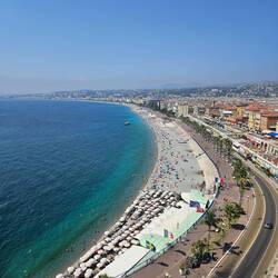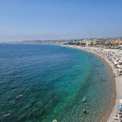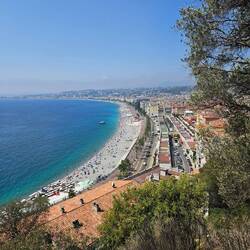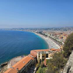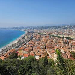 Today, I accepted the challenge from Erin to wake up at 6 am and headed to the beach. This is apparently when the water is at its clearest and most beautiful. Unfortunately, in an attempt to not wake up everyone from my room, I forgot to bring a towel and so couldn't go for a swim but enjoyed standing in the crystal clear water. I expected to be the only one there, but apparently, it is quite a popular thing to do as there were plenty of tourists with the same idea. It was worth the wake-up as the beach and the water were unbelievably clear and calm. I stayed here for a good couple hours as the sun slowly made its way onto the beach and the water. It didn't take long until the suns heat began to take effect, and I had to move on. As I try to always do in a new town, I booked a free walking tour for the city at about midday. It's a great way to learn about the city and is always super interesting. Rather than walking around with no idea what you're looking at, you get an insight into the history of the town and begin to understand why things are the way they are. It makes wandering through the city that much more enjoyable for the rest of your trip as you are looking out for things mentioned in the tour. Before that, however, I walked along the Promenade des Anglais, heading West to ensure I didn't walk through the areas outlined in the walking tour that I'd be doing soon. It was quite an enjoyable walk, especially out of the midday heat. But, it wasn't long until the heat became a bit much, and I found somewhere to sit before the walking tour. Eventually, though, the tour started, and we began at the end of the main strip at the statue of Apollo. She explained that the houses at the end of the main strip are incredibly historic and some of the first houses built in the town. They are very well preserved, but to live in them, not only is it incredibly expensive, but it also comes with rules. Firstly, you can't hang clothes on the front side of the buildings. Secondly, you can't have coloured blinds, and finally, you can not be naked in the vicinity of the window. Strange rules that are still somewhat enforced, apparently. We then went to a famous theatre and chocolate store, both incredibly old with an interesting history. The chocolate shop was a favourite of Queen Victoria who would drink tea there during breaks from the theatre. We had time to walk inside and see what chocolates were on offer, and it looked unbelievable. I wish I had the money to buy something but it was very, very expensive. After this, we moved on to the markets that were always present in Nice from morning until about 2pm. We had about 20mins to explore, and it was cool the amount of interesting food they had. We then moved on to the biggest church in the old town. It is quite big but easy to miss, as it is somewhat hidden in a little alleyway. She then showed us the best places for authentic French food while pointing out some cheaper places to eat if you're on a budget (which I am). We ended on the same Promenade des Anglais I had walked on earlier, but this time, we headed East. She explained the history behind the name, which translates to the English Promenade. Nice has always been a popular travel destination for the English people, especially during winter when they are escaping the harsh cold. But they complained that there wasn't enough walking opportunity along the water. The old Promenade used to be on top of the buildings that now track along the Promenade (photo 15 shows it well). To please them, they built a 6km long walkway and removed access to the roof of the buildings along the front. The Promenade now goes from the first castle constructed in Nice all the way to the airport. She ended the tour at the Eastern most point, which is great for photos, and then she heavily suggested we go to the top of the castle, it is free, and the views are amazing.