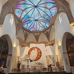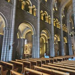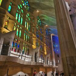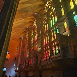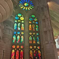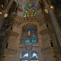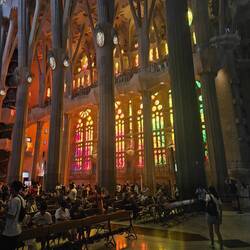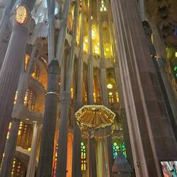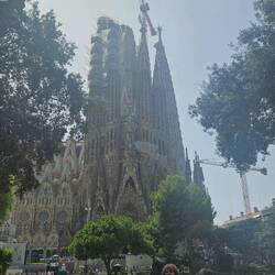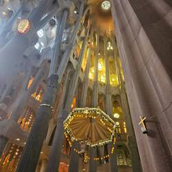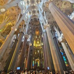 A part from this, they used the natural light and stained glass windows to accentuate the feeling of being in a forest. One side utilised green and red colours, while the other represents blue and red. Together, in combination with the columns that line the church, it truly felt like you were in a forest from the future. The sharp lines and white surfaces make it feel like you're in a spaceship, but the columns that expand and break apart to mimic the branches of trees (plus the beautiful colours from the windows), makes it feel like you're deep in a forest. They have even incorporated different thickness, colours, textures, and styles of each column to represent different tree species, only adding to the forest effect. The 2 final spires, protruding from the middle of the church, is expected to be over 170m tall and as such, the thickest columns are placed exactly here, to support the monumental weight of the final roof. It is expected to be the final part of construction, and an enourmas cross will be an icon for the whole city to observe. This height was no coincidence, as Gaudi wanted the building to be as large as possible but never exceed the height of the nearby mountain Montjuic. He is quoted as having said, "The work of man should never surpass that of god." This spire will partner the other 17 representing, in ascending order of height, the twelve apostles, the virgin mary, the four Evangelists and, tallest of all, Jesus Christ. As a result, each spire is topped with a monument to reflect the Christian symbol it denotes. The bull for Saint Luke, the eagle for Saint John, so on so forth. Heading underground, you can access the crypt, the first section of the church to be completed. This is where the actual church ceremonies are held, and the body of Gaudi is kept. I would have loved to see this, but i dont think it was supposed to be for tourists, and just for those wanting to pray. After this, the final part of the church takes you to the museum, in which you can see the models and drawings in which Gaudi had used to guide future architects in constructing La Sagrada Familia. It was cool to see the historical photos of the site and really put into perspective the monumental project that is being undertaken. Not only this, but we are luckily enough to potentially see the church completed. Huge tourist pressure and investment have meant that the government can put more money into the completion of the church and thus bring forward the completion date. 2026 is now the year in which we may be able to walk through the whole church. Words and pictures simply can not begin to portray the grandure and beauty that this structure holds, and as such, I will definitely be adding the finished La Sagrada Familia to my bucket list.
