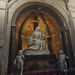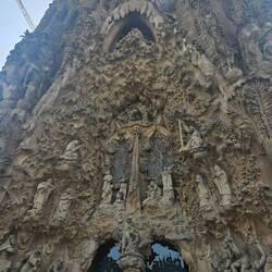 The plans Gaudi had for the passion facade would be as if it were hard and bare, as if made of bones, when compared to the nativity facade. Designed by Josep Maria Subirachs, this facade is much more simple and austere, with statues constructed with straight lines and sharp edges. It is very opposite to the other facade. Similarly, this facade represents the death of christ where the other represents his life. Construction began here in 1954 and was completed in 1986. The facade is supported by six large and inclined columns, designed to resemble strained muscles, atop which 18 lighter coloured columns appear. These are to represent the ribs of christ. The two of these work to complete the designs drawn by Gaudi and provoke dramatic effect in the observer. The facade itself is split into 3 portico. The first is a representation of the last supper and multiple stories within (i.e., kiss of judas, and the soldiers gambling for Jesus' robes). The second represents the cavalry of Jesus and the three Mary's. The final is the resurrection of Christ. It's amazing that the design does exactly as intended. Going from one side of the church to the other, you can see the stark difference in detail and emotion that is elicited. The nativity facade overwhelms you with amazement and wonder, whereas the passion facade is daunting and intimidating.