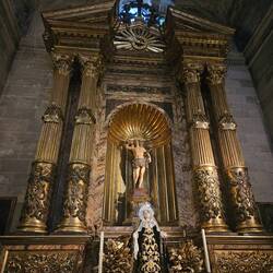 Despite all the beauty and work that went into the outside, the inside was far and away the most breathtaking and striking section of the whole church, and easily the most stunning thing I have seen so far on my trip. Entering from the nativity facade where there were endless detail and monuments representing the story of christ, I expected the inside to reflect this. In every Basilica in Europe, including St Peter's Basilica, every inch of wall and floor is covered by art, sculptures, or symbols that tell the story of christ. Given that this matched the facade in which I entered, I expected much the same. Instead, it was bare, futuristic, and escaped the Gothic / modern Gothic styles of Gaudi and instead leaned toward his more naturalistic styles. In fact, I don't think there was a single art piece in the whole location. The only sculptures that were present, was jesus on the cross above the alter on the Northern side, Joseph above the nativity facade, the virgin Mary above the passion facade, and Saint George, the patron Saint of Catalonia above the Glory facade to the South.