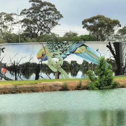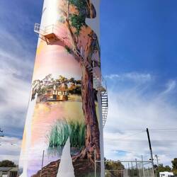 Met een omweg over allerlei plaatsjes, in Tocumwal wandelen en ontbijten en verder silo-Art trail, naar het eindpunt voor vandaag: Free Camp Yackandandah.