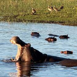 Das Highlight: Sundowner mit Hippos. Genüsslich schlürfen wir ein St. Louis und schauen den Hippos vor uns im Wasser an. Zum Heimfahren müssen wir an ihnen vorbei. Langsam fahren wir im Tuckergang vorbei, eines nach dem anderen taucht unter und ist weg. Dann geht’s ins Camp, das Abendessen ruft.Read more