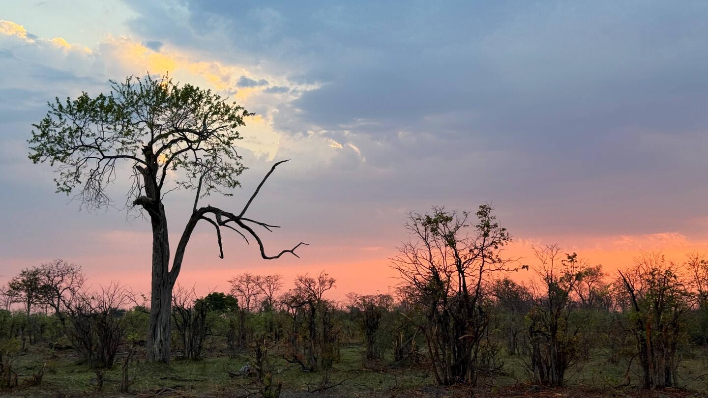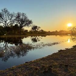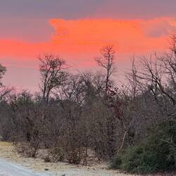 Wir fahren gen Westen im Sonnenuntergang zu unserer Lodge, Empfang am Lagerfeuer, frisch machen und dann lecker Abendessen. Die Bottswaner kochen genau so gut wie die Südafrikaner! Jetzt lieg ich im Zelt, lausche all den Insekten und den jaulenden Hyänen. Übernachten im Zelt ist schon spannend! Da draußen mag es ganz schön zugehen.