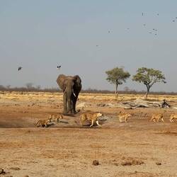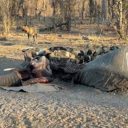 Die Wildhunde haben die Oberhand. Nach und nach verlässt, weil voll gefressen, ein Wildhund nach dem anderen den Elefanten. Als die Mehrheit kippt übernehmen die Hyänen mit kurzem Gebrüll den Kadaver. Sie haben kräftigere Zähne, ihr Knochenknacken ist viel lauter.