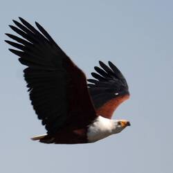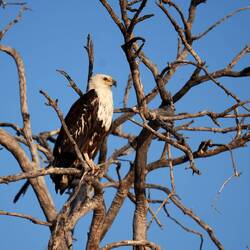 Wir sehen noch eine Herde Zebras rennen, immer wieder Giraffen müssen für eine Flussdurchquerung einen trinkenden Afrikanischen Seeadler aufscheuchen und begegnen dann einen einzelnen Elefantenbullen. Dieser mutiert ein wenig zum „angry elefant“ und läuft auf uns zu. Als Jacks den Jeep startet verzieht sich der Elefant rasch im Busch. Wie der Kerle mit Drohgebärden auf uns zu geht war atemberaubend!