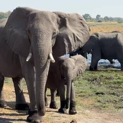 Wir fahren weiter. Schon folgt das bisher beste Highlight: wir fahren an die Seite einer recht kleinen Elefanten-Gruppe und machen den Motor aus. Die Elefanten gehen ins Wasser und trinken. Und es kommen weitere kleine Elefantengruppen, von rechts und von links, man weiß gar nicht wo man hinschauen soll. Sie kommen, mustern uns und zeigen ihre Größe (Motto „ich bin groß und stark, lass du mich in Ruhe, dann lass ich dich in Ruhe“). Überall Elefanten und wir mitten drin. Alle, große, mittlere, kleine und ganz kleine Elefanten gehen nach und nach ins Wasser. Sie trinken, bespritzen sich mit Wasser, so lange es ihnen gefällt. Die ganz Kleinen fallen immer wieder hin und werden von den Müttern und Tanten liebevoll „aufgerüsselt“. Letztlich durchkreuzten sie das Wasser, bleiben dann kurz stehen und beschmeißen sich mit Sand. Was für eine Szenerie: im Hintergrund eine einzige Staubwolke mit Elefanten und vorne planschende nasse Elefanten! Wunderschön!