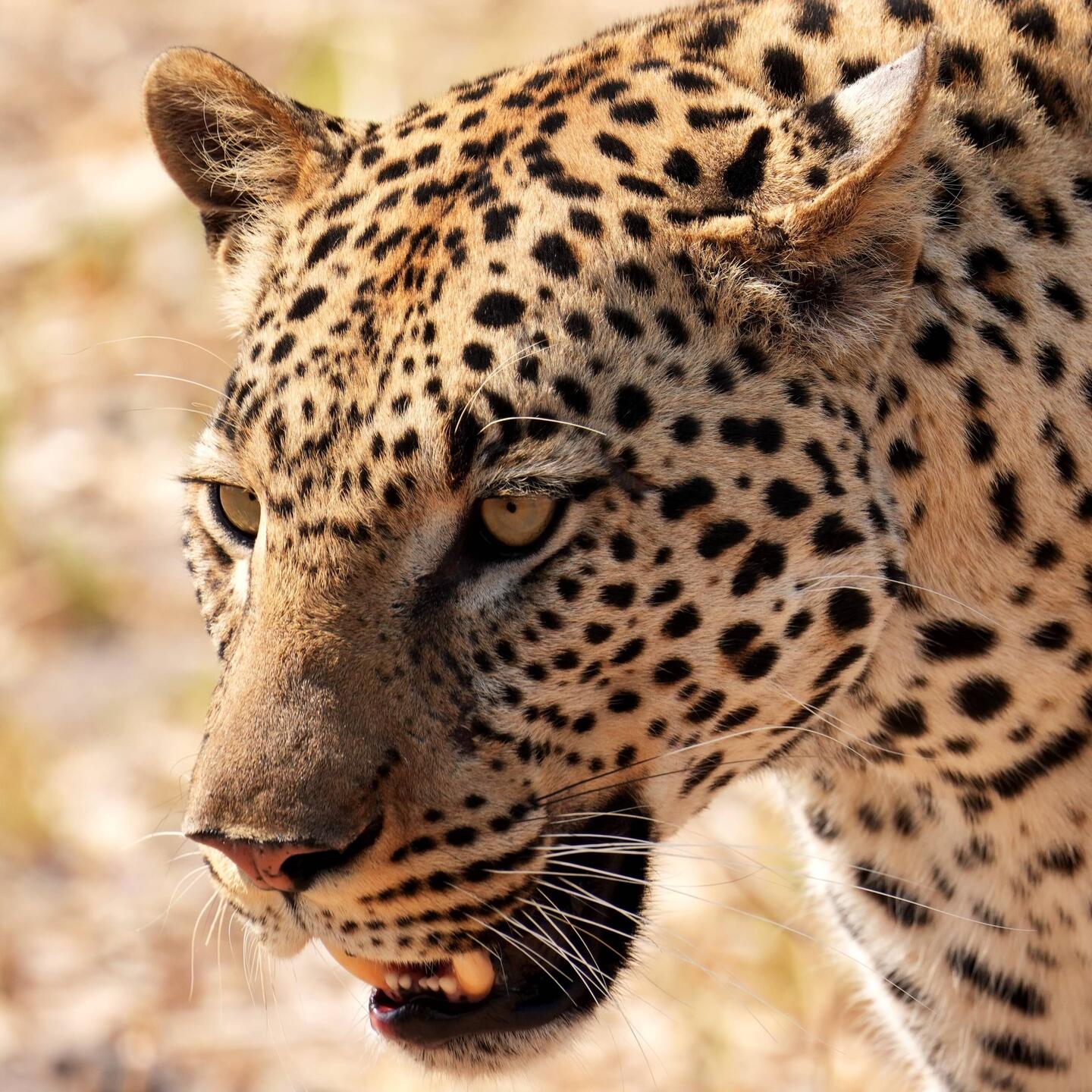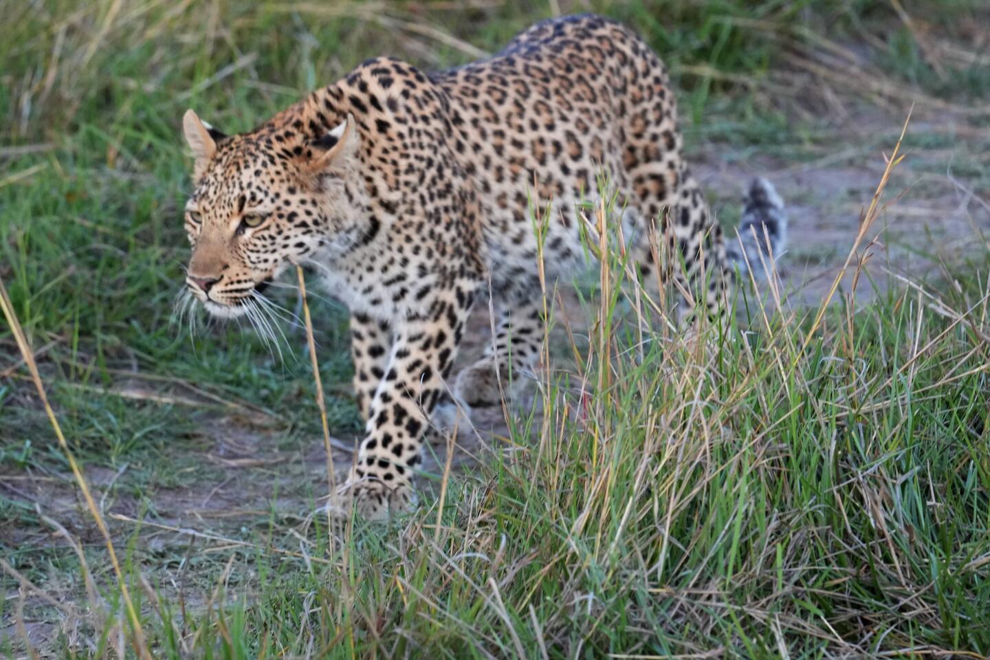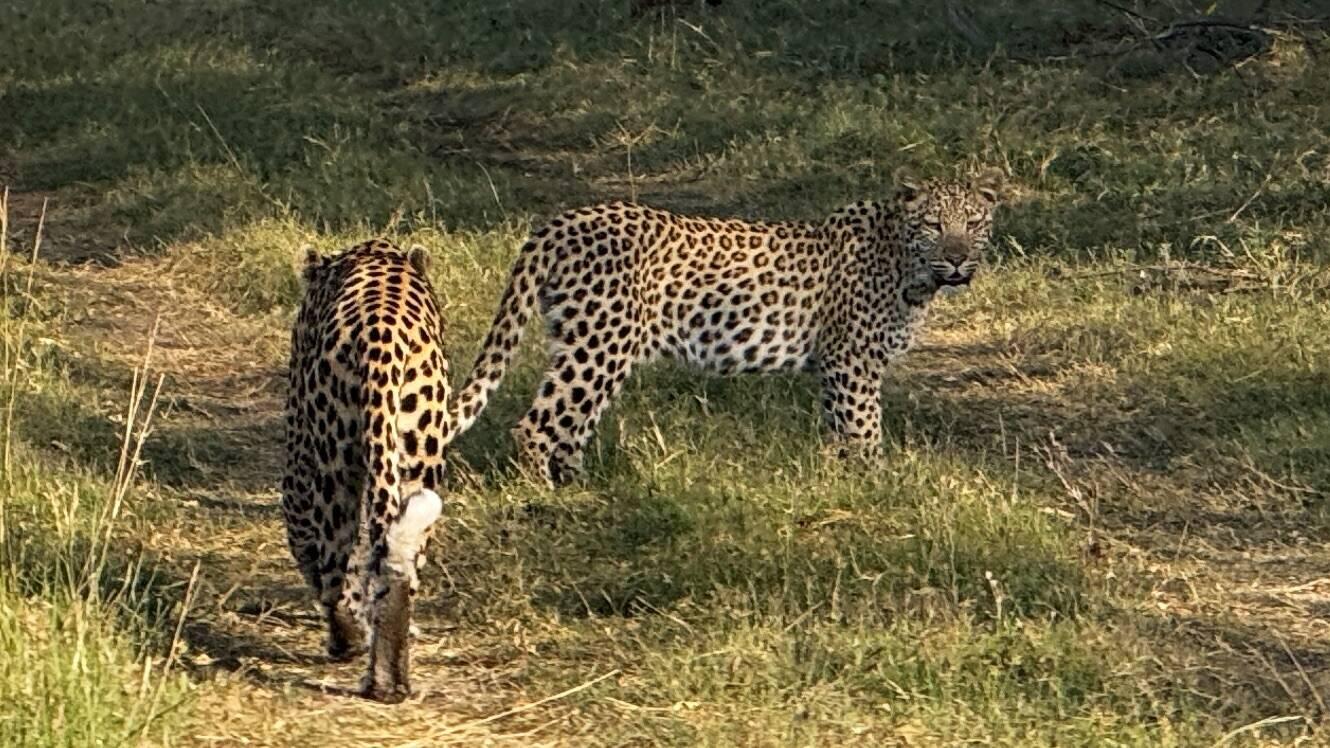 Da kommt eine Leopardenmutter mit ihren 2 Jungen aus dem Grasland direkt auf uns zu! Sie laufen einen Meter an unserem Jeep vorbei. Wow!