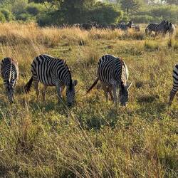 Dann in der Ferne eine Herde mit Energie geladenen Zebras, die eine Tsetsebee-Antilope jagen, sich gegenseitig schubsen und anstänkern. Zwei kämpfen und treten sich gegenseitig mit den Hufen. Alles staubt in der Morgensonne!