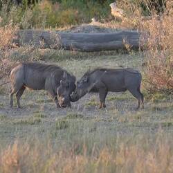 Zunächst sehen wir zwei kämpfende Warzenschweine. Schnell gibt der Kleinere auf und macht sich aus dem Staub.