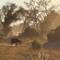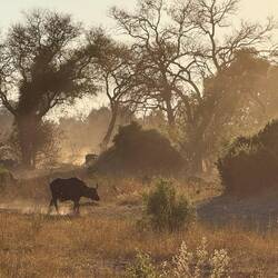 Einen Moment später in unserer Nähe ähnliches mit Wasserbüffeln. Sie streiten jedoch nicht sondern durchziehen friedlich das Land. Auch hier schöne Bilder mit den Tieren im Staub im Morgenlicht!