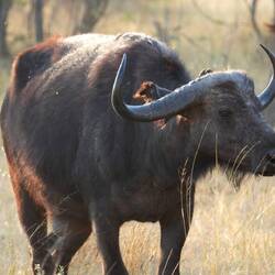 Dann eine Begegnung mit ein paar Wasserbüffeln. Als ich zum Abschied gedankenlos meine Hand hebe rennt er auf uns zu um uns zu vertreiben! Das ist ihm gelungen, Jacks startet schnell den Motor und fährt hurtig davon. Nach ein paar Metern lässt der Wasserbüffel ab und bleibt stehen, er hat ja gewonnen und sein Ziel erreicht.